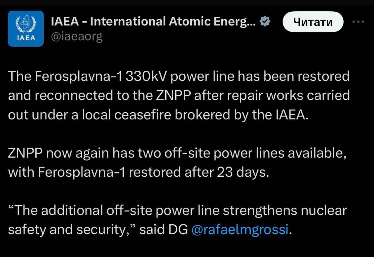 Лінію електропередачі «Феросплавна-1» напругою 330 к В відновлено та знову підключено до ЗАЕС після ремонтних робіт, проведених у рамках локального припинення вогню, укладеного за посередництва МАГАТЕ.