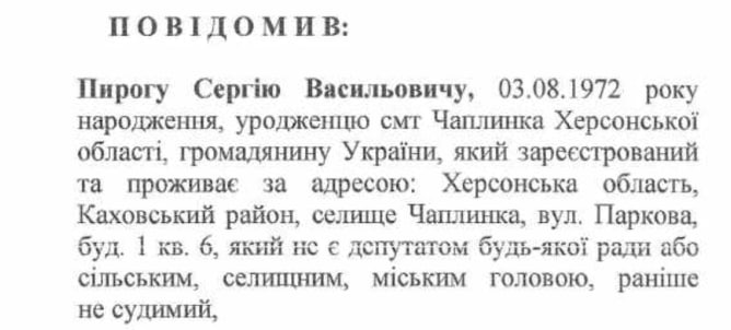 Слідство встановило, що Пирог Сергій Васильович, 1972 року народження, з квітня 2024 року працює на окупаційну адміністрацію Чаплинки. Він обіймає посаду “першого заступника глави” з питань фінансів і економіки.
