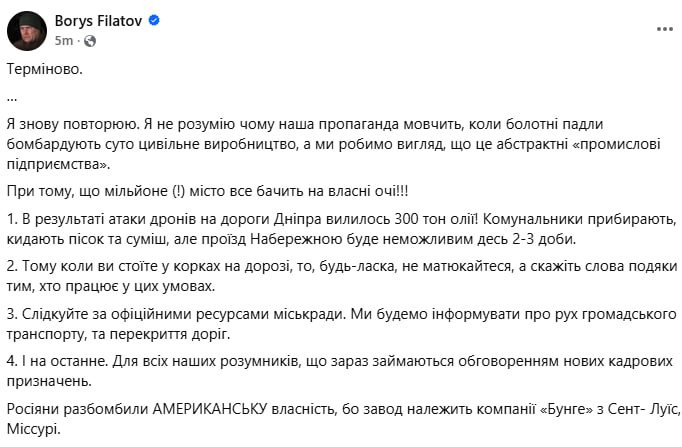 Філатов: після атаки дронів у Дніпрі на дороги вилилось 300 тонн олії, пошкоджено завод «Олейна» американської компанії Bunge Мер Дніпра Борис Філатов повідомив, що внаслідок […]