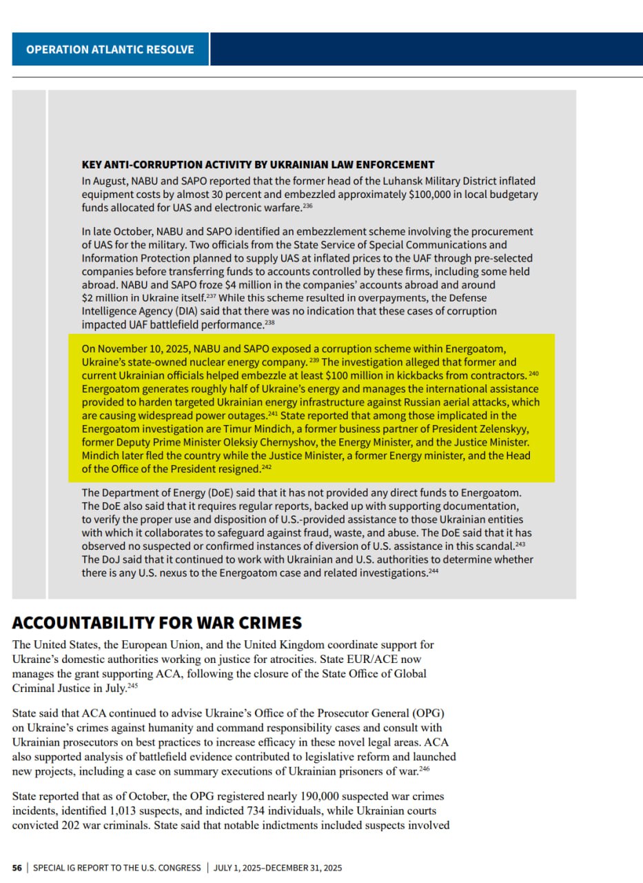 ️У звіті для Конгресу США “Special IG Report to the U.S. Congress” за період 1 липня — 31 грудня 2025 року зазначено: “10 листопада 2025 року НАБУ та САП викрили корупційну схему в межах Енергоатому”. Документ описує розслідування щодо “щонайменше 100 млн доларів США відкатів від підрядників”.