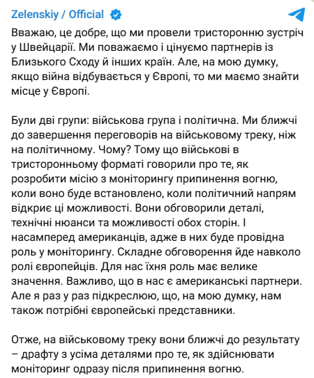 Володимир Зеленський повідомив: “Вважаю, це добре, що ми провели тристоронню зустріч у Швейцарії”. Працювали “дві групи: військова і політична…Ми ближчі до завершення переговорів на військовому треку, ніж на політичному”.