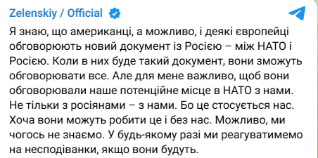 Зеленський окрема додав: “Американці, а можливо, і деякі європейці обговорюють новий документ із Росією – між НАТО і Росією…Важливо, щоб вони обговорювали наше потенційне місце в НАТО з нами”.