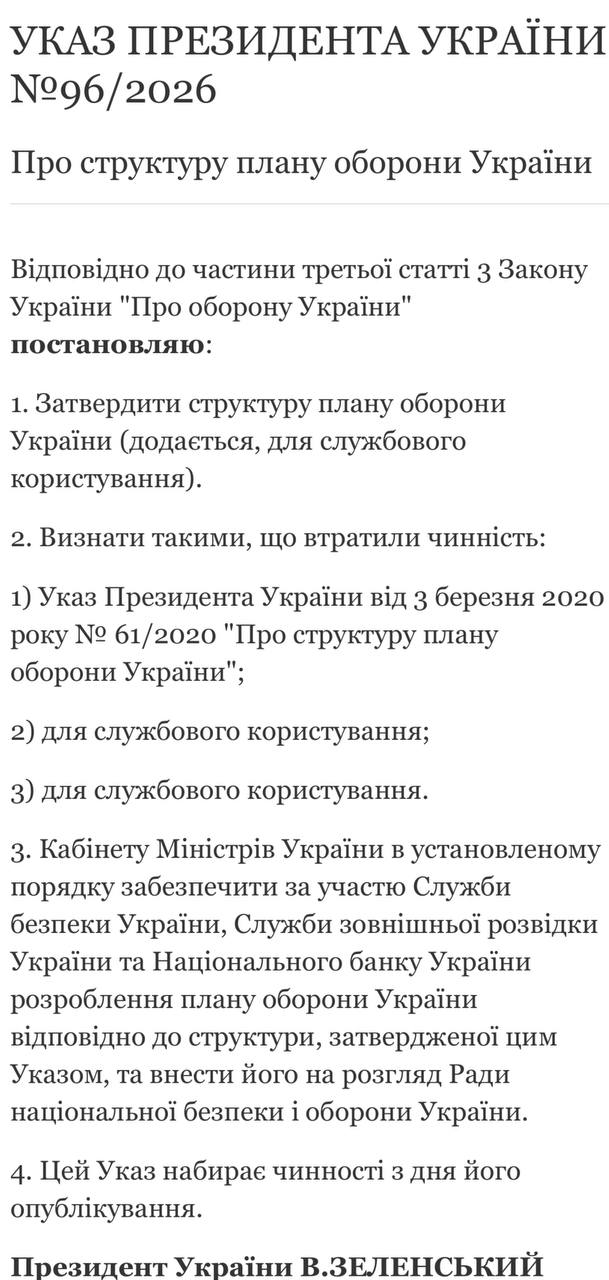 Крім того, президент доручив Уряду, за участю СБУ, Розвідки та Нацбанку, забезпечити розроблення Плану оборони України відповідно до затвердженої структури.