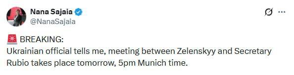 Держсекретаря США Марко Рубіо завтра зустрінеться із Володимиром Зеленським, зустріч запланована на 17:00 за мюнхенським часом (18:00 за Києвом), — журналістка Fox News Нана Саджая.