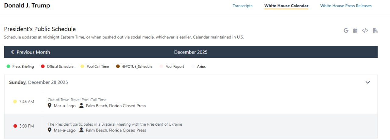 Зеленський і Трамп проведуть закриту зустріч 28 грудня о 22:00 за київським часом у резиденції Мар-а-Лаго