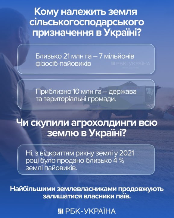 За оцінками Zeminvest, сьогодні близько 21 млн гектарів сільгоспземлі належать фізичним особам-пайовикам, а ще близько 10 млн гектарів — державі та територіальним громадам. З моменту відкриття ринку землі у 2021 році власники паїв продали лише близько 4% свого земельного банку.