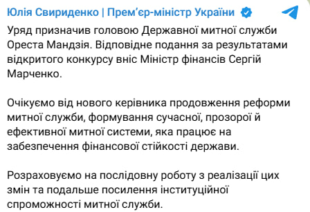 Відповідне подання за підсумками відкритого конкурсу вніс міністр фінансів Сергій Марченко, повідомила прем’єр-міністерка Юлія Свириденко.