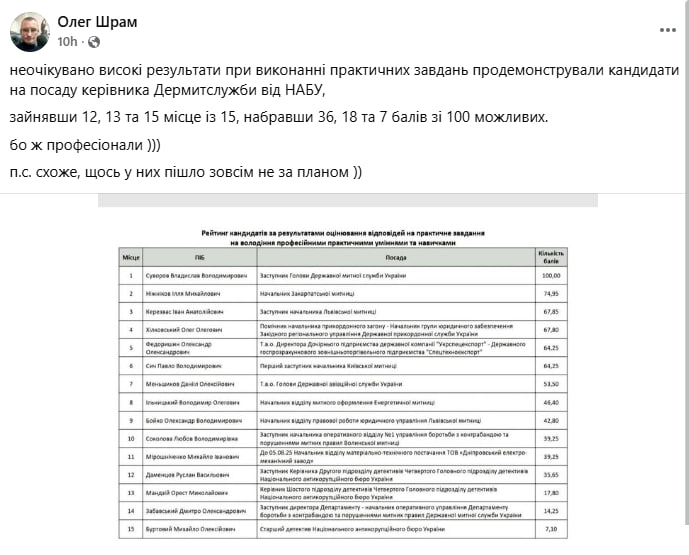 Ексголова конкурсної комісії ДБР Олег Шрам заявив, що кандидати на посаду керівника Держмитслужби, яких він пов’язує з НАБУ, за результатами практичних завдань посіли 12, 13 та 15 місця з 15, набравши 36, 18 та 7 балів зі 100 можливих: “Неочікувано високі результати при виконанні практичних завдань продемонстрували кандидати на посаду керівника Дермитслужби від НАБУ… бо ж професіонали п.с. схоже, щось у них пішло зовсім не за планом”.