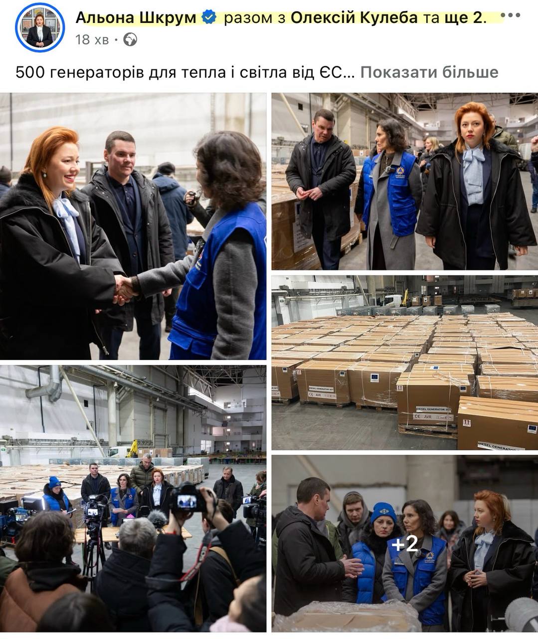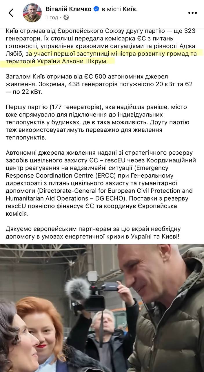 Тоді як на сторінці самого Кличка, звітуючи про отримання допомоги, окремо відзначили участь першої заступниці Кулеби Альони Шкрум, а також додали відео, де з перших кадрів очевидна її присутність на події.