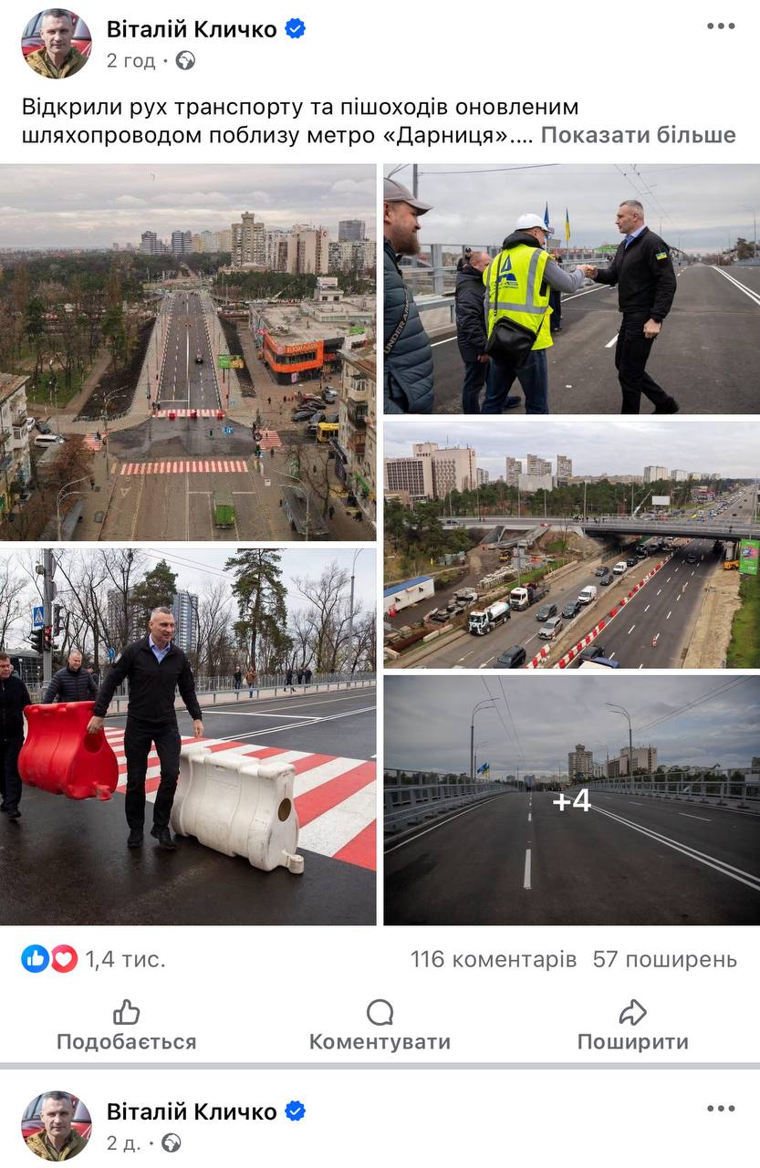 За сьогодні у соцмережах мера Києва вийшов лише один допис, де Кличко вчергове попіарився на мостах, а саме відкритті «рух транспорту та пішоходів оновленим шляхопроводом поблизу метро «Дарниця».