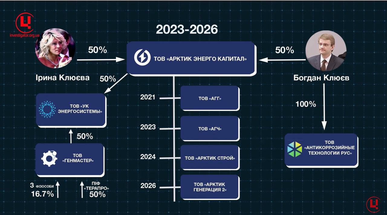 Ще у 2021 році родина Клюєвих обзавелася «Арктик энерго капитал», яка на сьогодні перетворилася в групу компаній. Ці компанії в обхід санкцій постачають російським підприємствам, зокрема повʼязаним з енергетикою та оборонкою, імпортне обладнання і матеріали. Від генераторів американської Caterpillar — до антикорозійних фарб французької MAESTRIA.