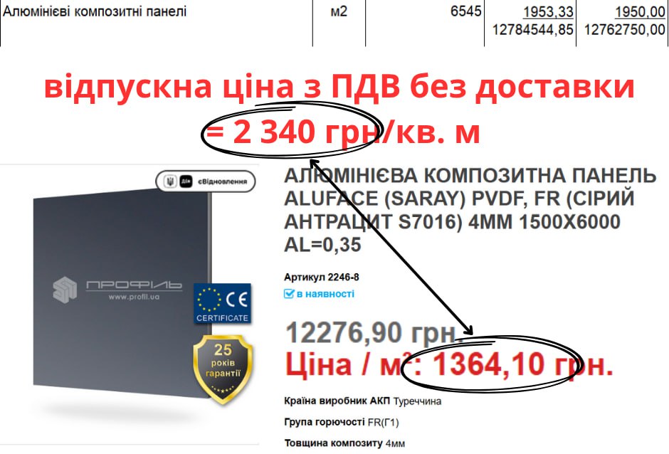 У кошторисі проекту 15,32 млн грн, або 45% вартості матеріалів, припадає на алюмінієві композитні панелі за ціною 2 340 грн/м², що значно дорожче за ринок, де аналогічні панелі коштують 1 126–1 364 грн/м². Переплата лише за цією позицією перевищує 6 млн грн.
