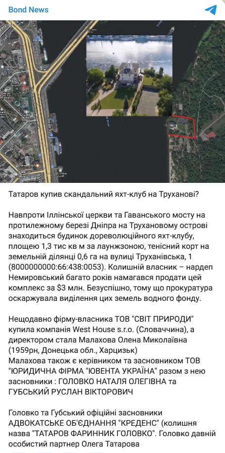 ⁉️Яхт-клуб на Труханові, ТОВ “Світ природи” і West House s.r.o. і Татаров: Бондаренко про зміну власника комплексу та зв’язок засновників із адвокатським об’єднанням, пов’язаним із заступником голови ОП