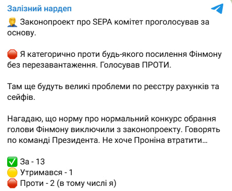 Комітет ВРУ з податкової політики підтримав за основу законопроєкт щодо приєднання України до SEPA, повідомив нардеп Ярослав Железняк. За його словами, рішення ухвалили 13 голосами “за”, один депутат утримався, двоє — проголосували проти.