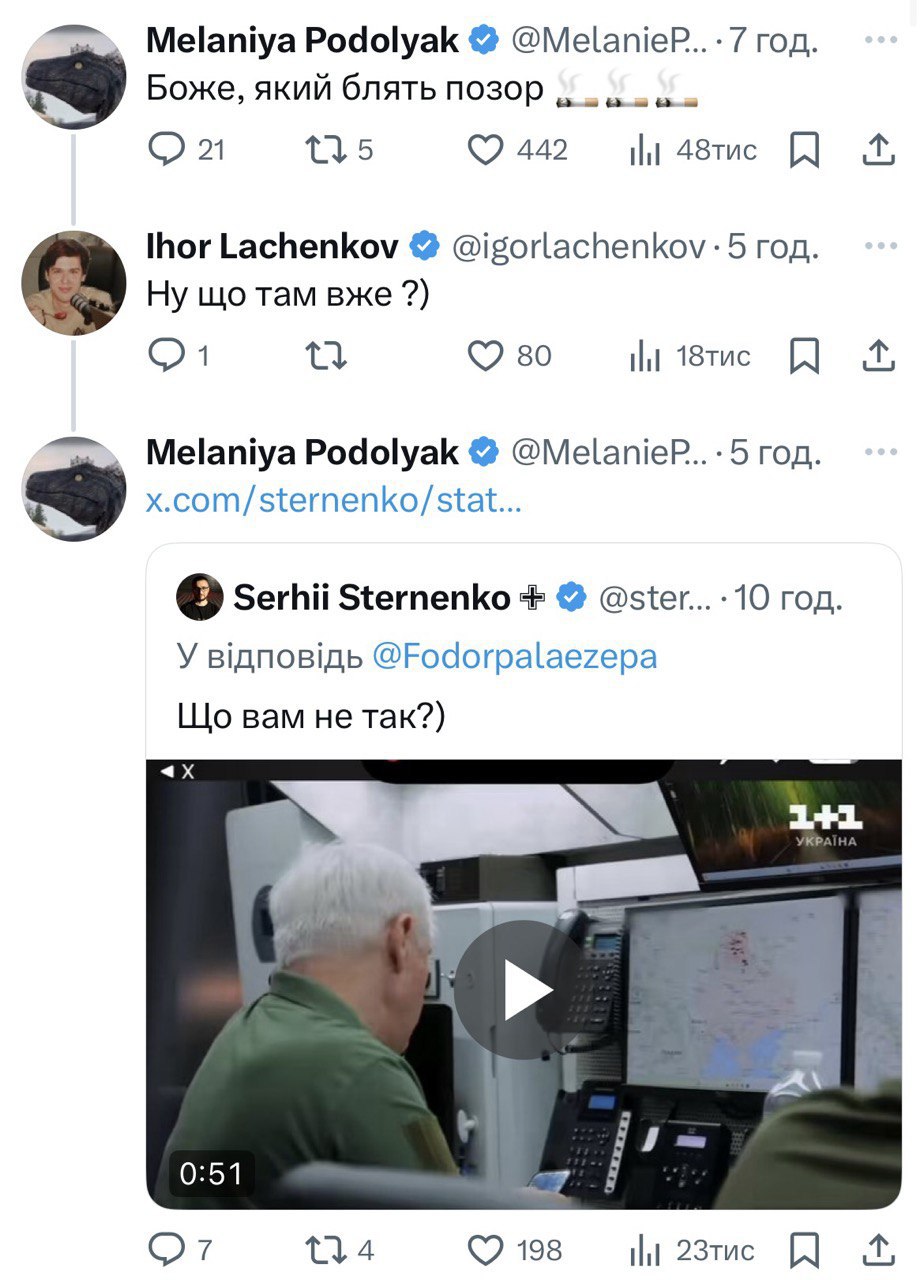 Блогери ОП Меланія Подоляк, Ігор Лаченков, Сергій Стерненко явно здивувалися примітивному піару командувача Повітряних сил Анатолія Кривоножка. Відео «успіхів» Кривоножка на фоні ураження росіян цивільних та військових обʼєктів за допомогою БПЛА та ракет забезпечив близький до ОП ведучий Дмитро Комаров.
