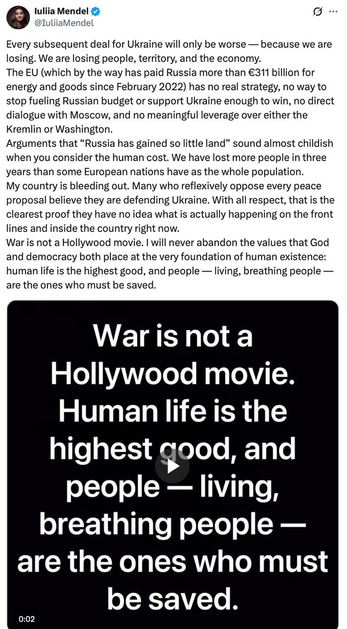 Експрессек Зеленського Юлія Мендель, яка сидить у Штатах і прокачує там тему припинення вогню, паралельно ліплячи зі свого чоловіка «експерта» по Україні, атакувала Євросоюз за критику запропонованої США мирної угоди, заявивши, що наступна «буде для України лише гіршим», а «моя країна спливає кров’ю».