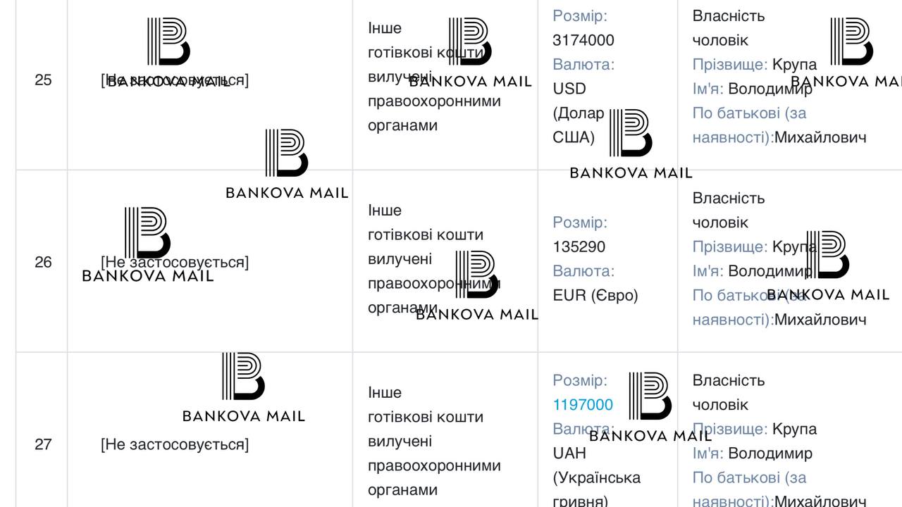 Окремо вказано готівку чоловіка: $3,17 млн, 135,2 тис. євро та 1,19 млн грн. Ці кошти ДБР вилучило в жовтні 2024 року; вони арештовані та є речовими доказами.