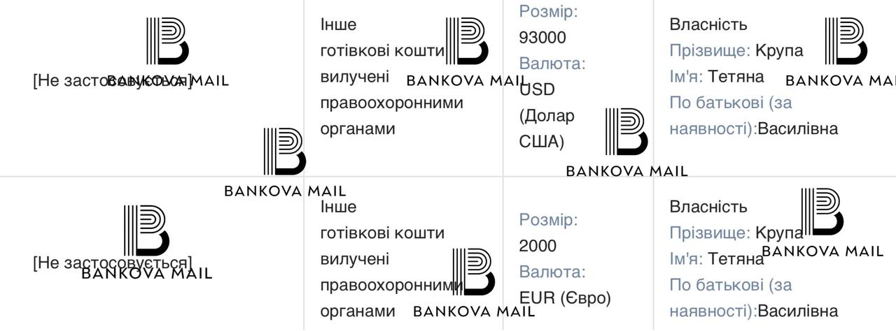 Також задекларовано сережки Dior за понад 700 тис. грн, годинник Rolex за 405 тис. грн і готівку $93 тис. та 2 тис. євро, вилучені під час обшуків.