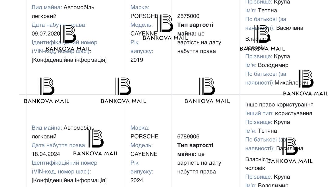 Ексочільниця Хмельницького МСЕК Тетяна Крупа, підозрювана в незаконному збагаченні, 18 січня 2026 року подала декларацію за 2024 рік. У ній вона вказала Porsche Cayenne за 6,78 млн грн, додавши його до вже задекларованого Porsche Cayenne 2019 року.