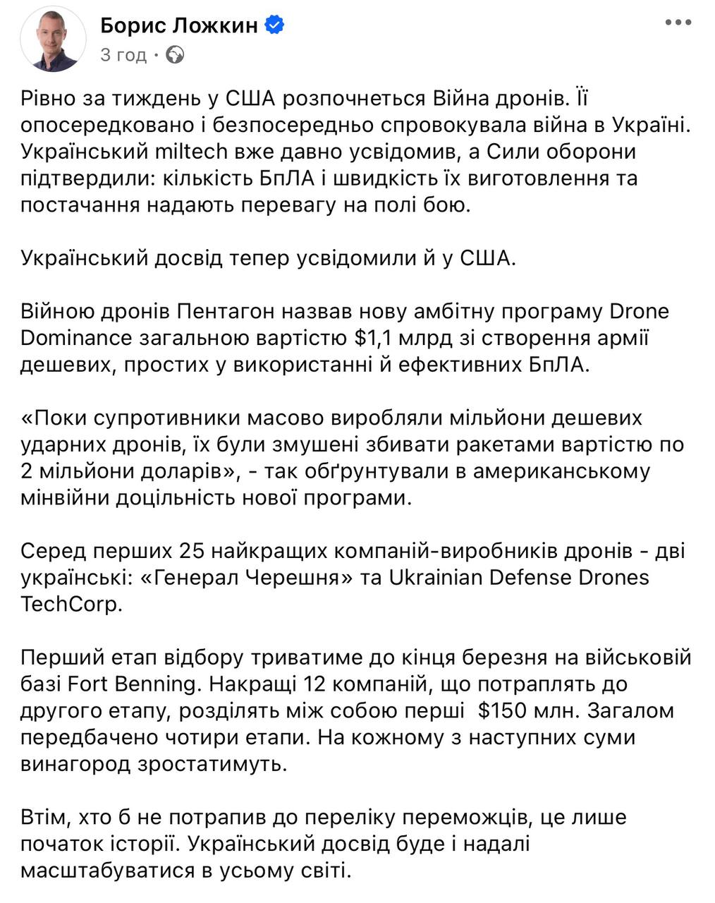 Борис Ложкін опублікував допис, який фактично підтверджує чутки на ринку miltech про його активну участь у заробітку на війні. Водночас він прямо не демонструє своєї причетності до компаній, зокрема до виробників дронів.