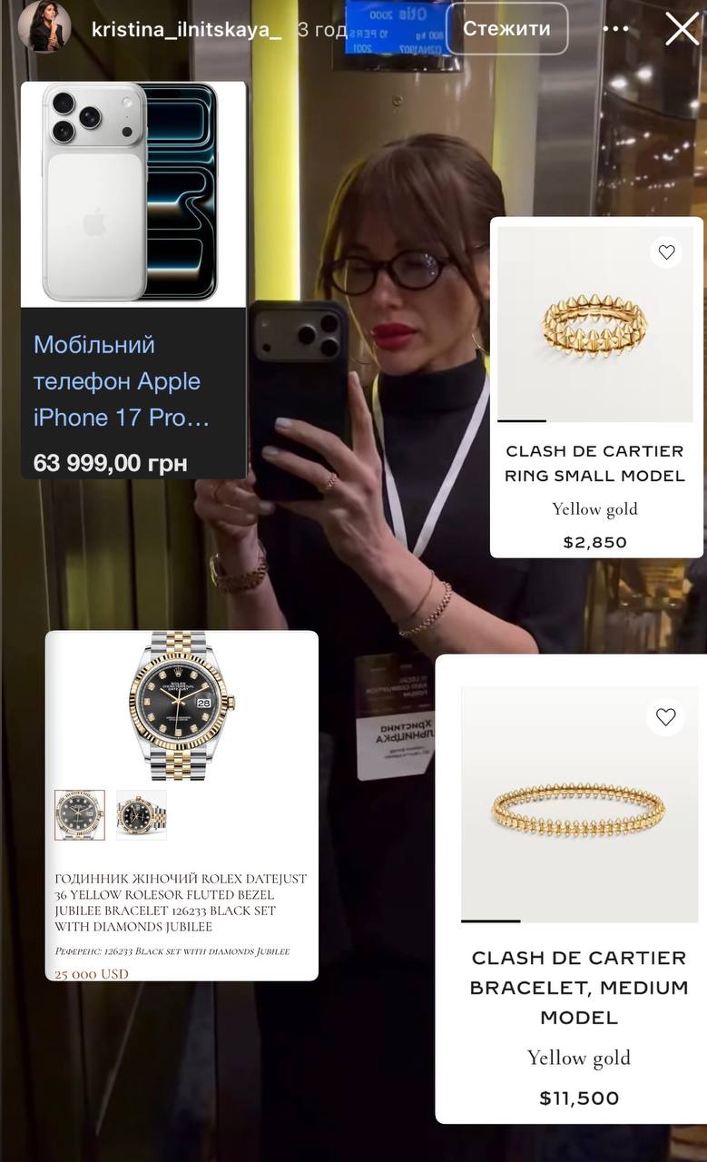 На руках Ільницької каблучка Cartier за $2,850, браслет Cartier за $11,500 та годинник Rolex за $25,000.