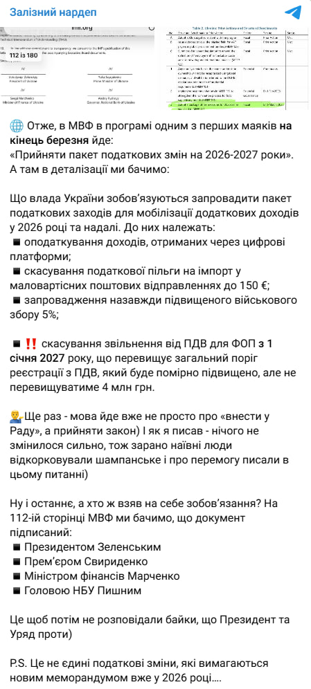 Нардеп Ярослав Железняк повідомив, що одним із перших структурних маяків програми МВФ є вимога “прийняти пакет податкових змін на 2026–2027 роки” до кінця березня 2026 року. За його словами, документ передбачає запровадження пакета податкових заходів для мобілізації додаткових доходів, зокрема оподаткування доходів із цифрових платформ, скасування пільги на імпорт маловартісних посилок до 150 євро та збереження підвищеного військового збору 5%.