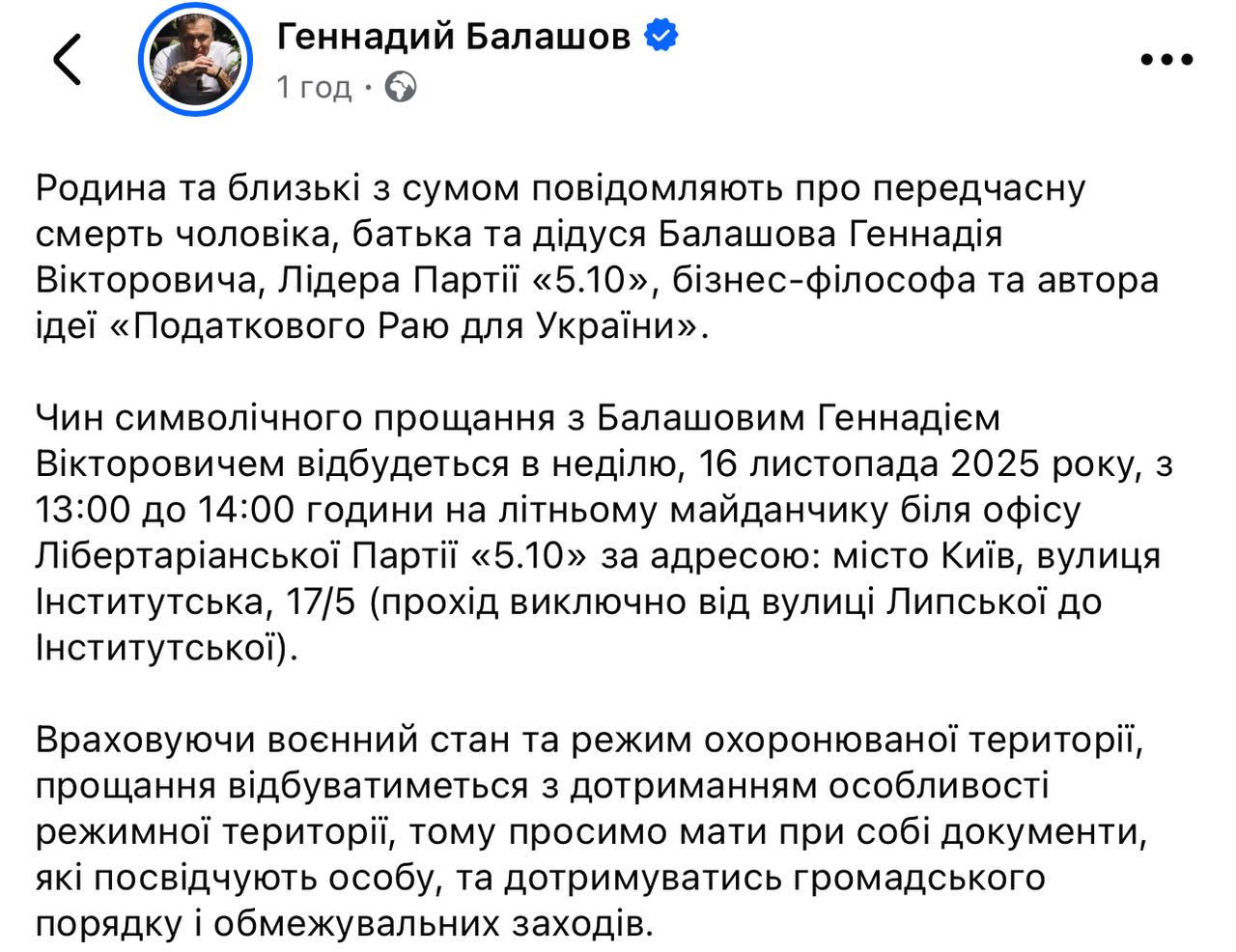 На прощання з Геннадієм Балашовим в Києві вимагають мати при собі документи, адже прощання проходитиме на Інституцькій біля офісу партії 5.10