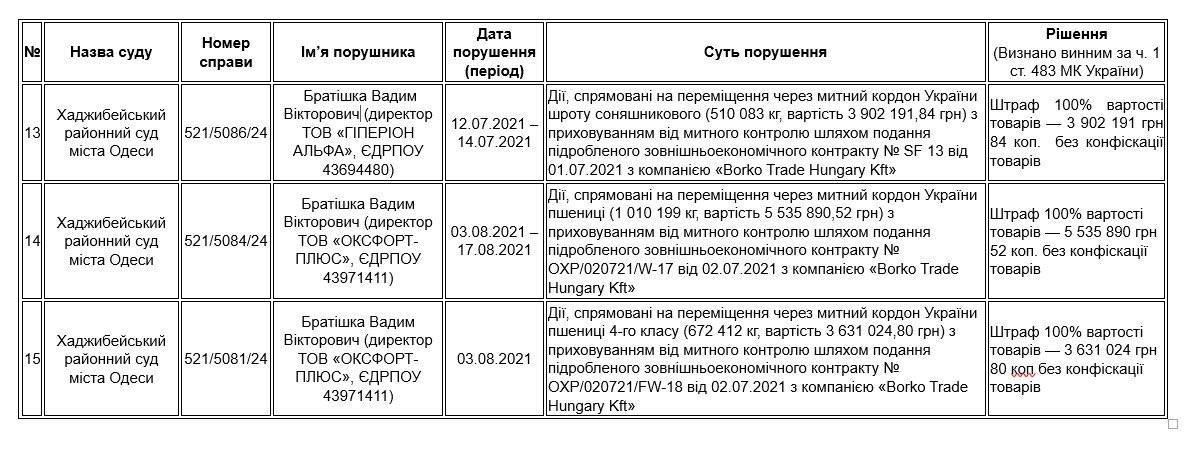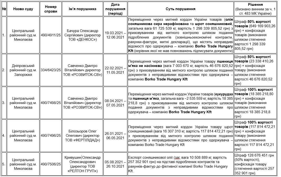 Суди в Миколаєві, Запоріжжі та Одесі визнали керівників українських компаній винними у поданні підроблених документів при митному оформленні. Їм призначено штрафи у розмірі 50–100% вартості товарів – сотні мільйонів гривень грошових стягнень.