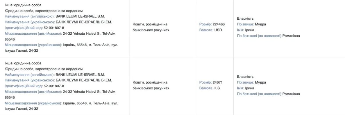 Згідно з декларацією, $224 тис. із задекларованих коштів зберігаються у Тель-Авіві. Мудру також розглядають серед кандидатів на посаду міністра юстиції України.
