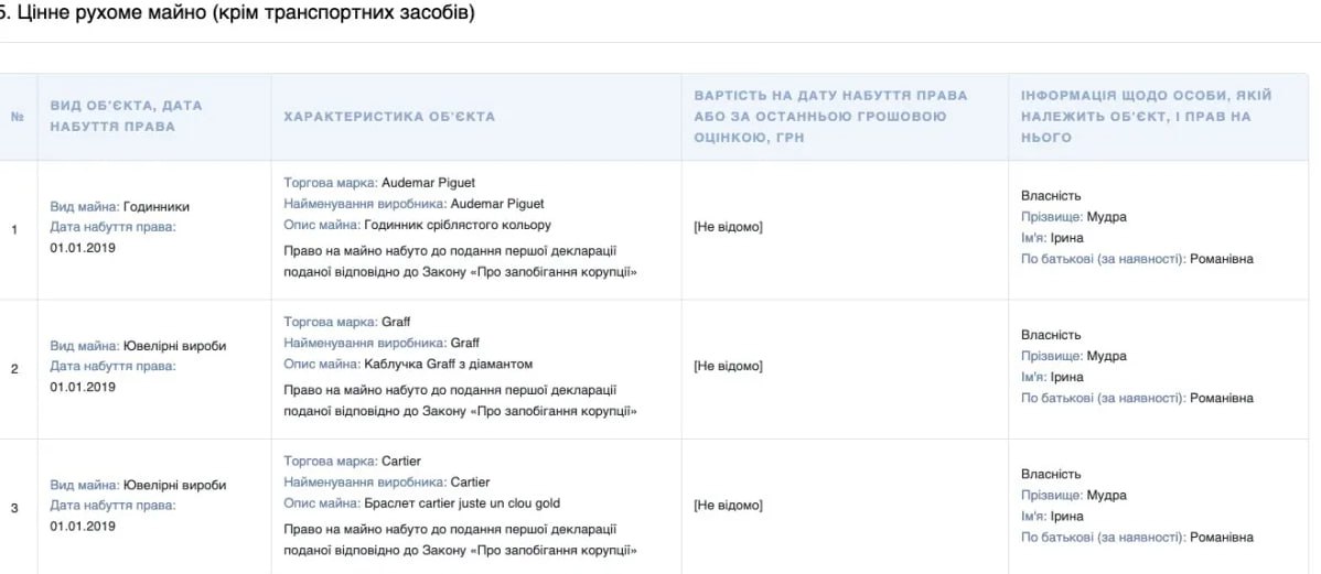 У декларації посадовиці зазначені ювелірні вироби брендів Graff і Cartier. Серед них — прикраса Graff з діамантом і золотий браслет Cartier.