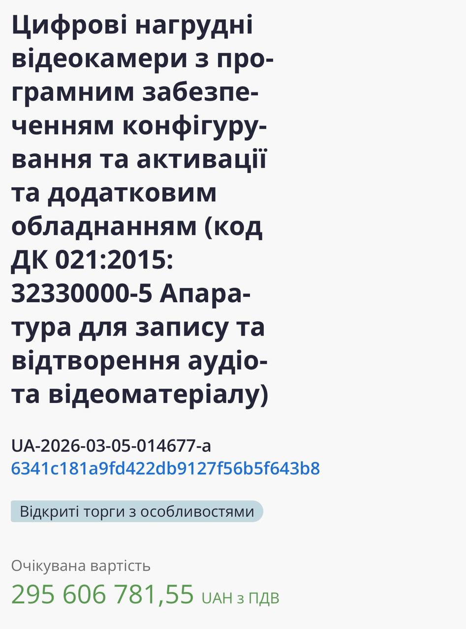 Міноборони уклало контракт на 5 525 нагрудних камер Motorola для ТЦК на 290,91 млн грн. Тендер завершився 17 квітня, перемогло ТОВ «Доля і Ко.Лтд», яке має поставити обладнання до 31 липня 2026 року.