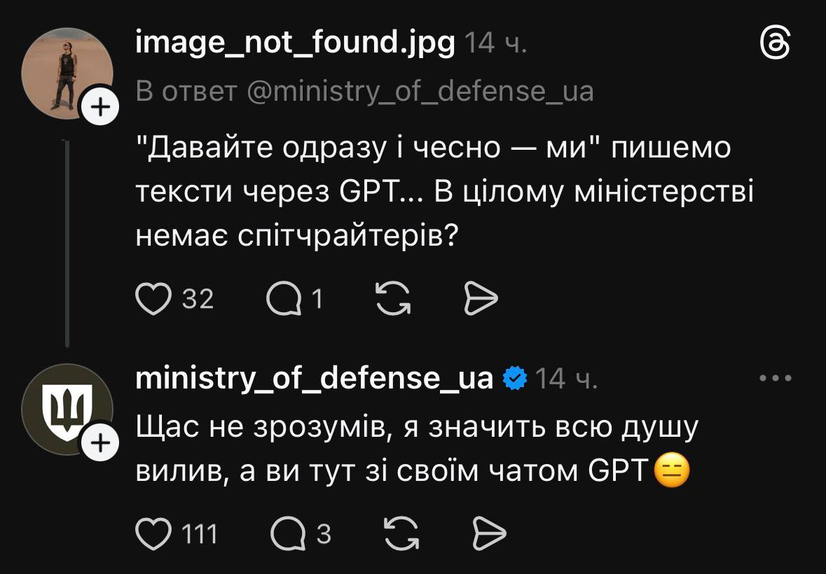 Міністерство оборони вирішило з гумором «залетіти» в Threads, але їх за тамтешніми традиціями одразу прокатили на «шакалячому експресі»