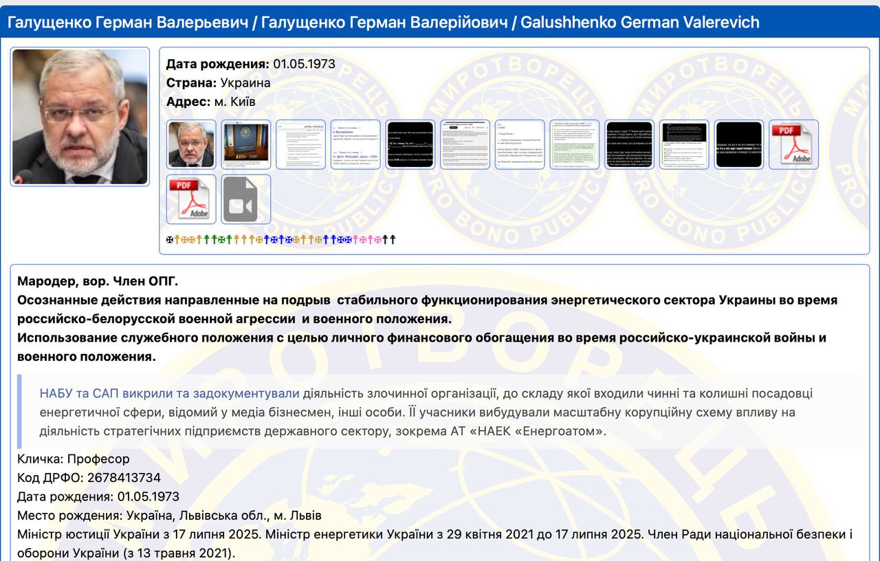 Міністра юстиції Галущенка, внесли до бази «Миротворець» На порталі йдеться, що він «мародер, крадій та член ОЗГ» чиї «свідомі дії, спрямовані на підрив стабільного функціонування енергетичного сектору України під час російсько-білоруської військової агресії та воєнного стану.» Крім того його звинувачують у «використанні службового становища з метою особистого фінансового збагачення під час російсько-української війни та воєнного стану».
