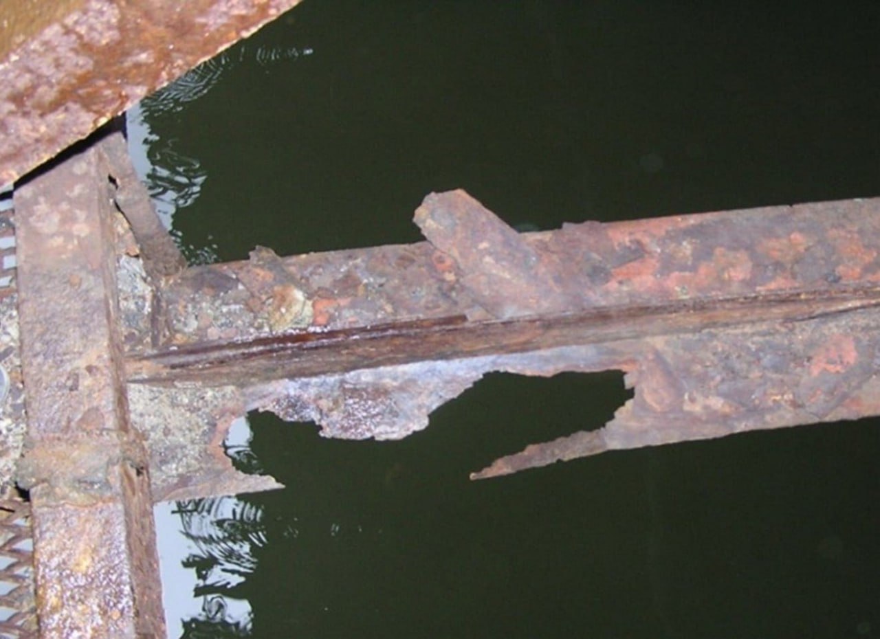 На фото: міст імені Є.О. Патона у Києві. Корозія понад 50 % поперечного перерізу горизонтальної в’язі. Фото 2018 року.