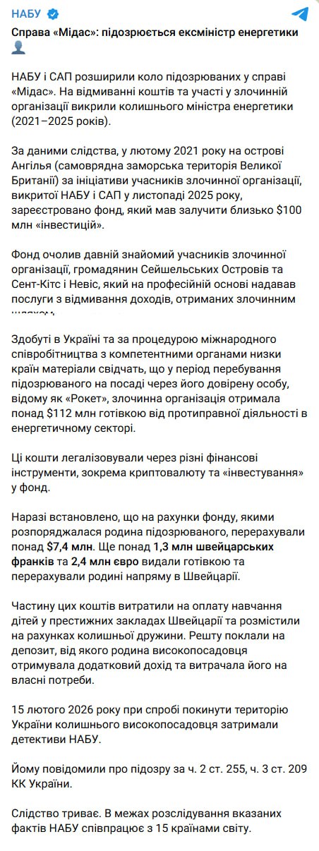 НАБУ вважає, що злочинна організація отримала понад $112 млн у енергетичному секторі, частину коштів легалізували через інвестиції та криптовалюту. На рахунки, пов’язані з родиною, перерахували понад $7,4 млн, ще понад 1,3 млн франків і 2,4 млн євро передали у Швейцарії.