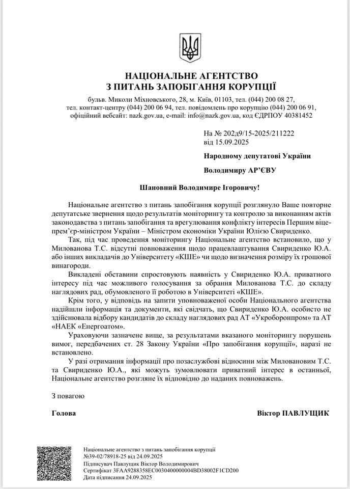 Також у НАЗК кажуть, що Свириденко особисто не обирала кандидатів в наглядові ради “Укроборонпрому” та “Енергоатому”, де Милованов сукупно отримує понад пів мільйона гривень на місяць. І тут варто зазначити, що Милованов був кандидатом саме від Мінекономіки, яке тоді очолювала прем’єрка.