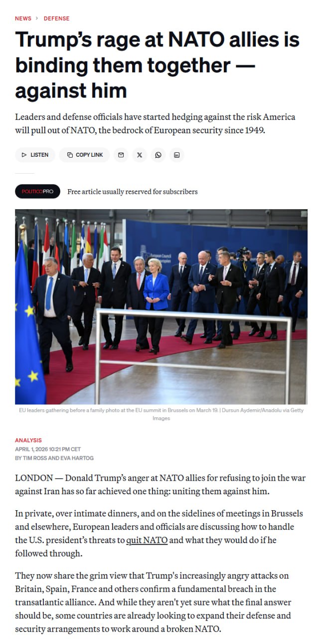 ️”НАТО вже розвалюється”: Європейські чиновники заявляють про “параліч” Альянсу і ризик його розпаду, союзники обговорюють сценарій виходу США після війни з Іраном — Politico