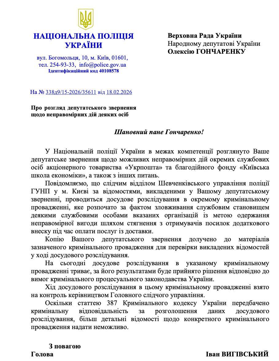 ️Нацполіція відкрила кримінальне провадження за фактом можливого зловживання службовим становищем посадовими особами “Укрпошти” та фонду Милованова — Гончаренко