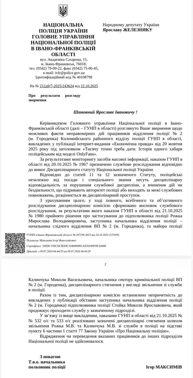 ️На Прикарпатті звільнили поліцейських, які вимагали хабар від моделі OnlyFans за закриття справи проти неї Звільнили заступника начальника відділення поліції міста Городенка підполковника поліції Мирослава Рожка та начальника сектору кримінальної поліції майора поліції Миколу Калинчука.