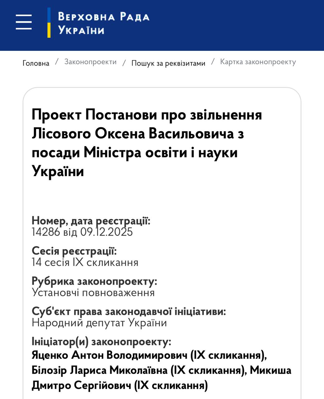 На сайті ВР зʼявився проєкт постанови про звільнення Оксена Лісового з посади міністра освіти і науки України, ініційований нардепом Антоном Яценко