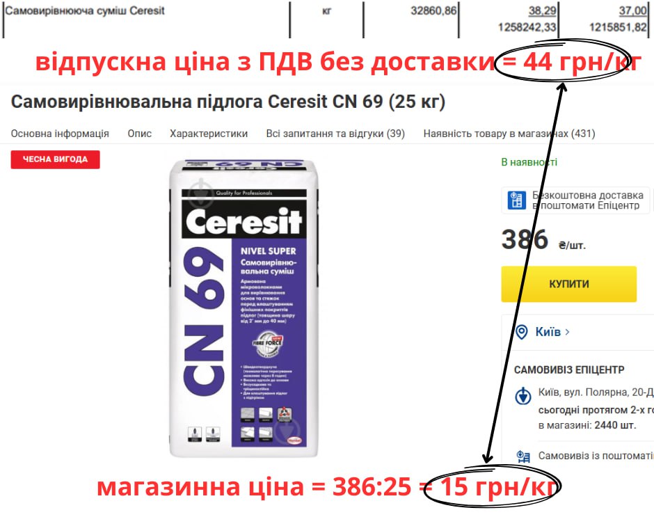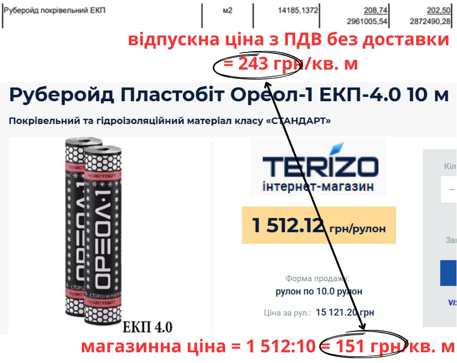 Частину матеріалів замовили дорожче ринку. Самовирівнююча суміш Ceresit коштує 44 грн/кг проти ринкових 19 грн/кг, акрилова фарба — 230 грн/кг проти 150 грн/кг, а руберойд — 243 грн/м² проти 144–151 грн/м². Загальна переплата за цими позиціями перевищує 9 млн грн. Ціни на бетон, арматуру, асфальтобетон та цеглу наближені до ринкових.