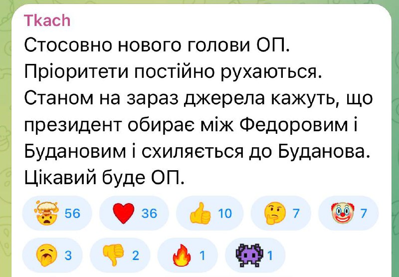 Стосовно нового голови ОП. Пріоритети постійно рухаються. Станом на зараз джерела кажуть, що президент обирає між Федоровим і Будановим і схиляється до Буданова. Цікавий буде ОП.