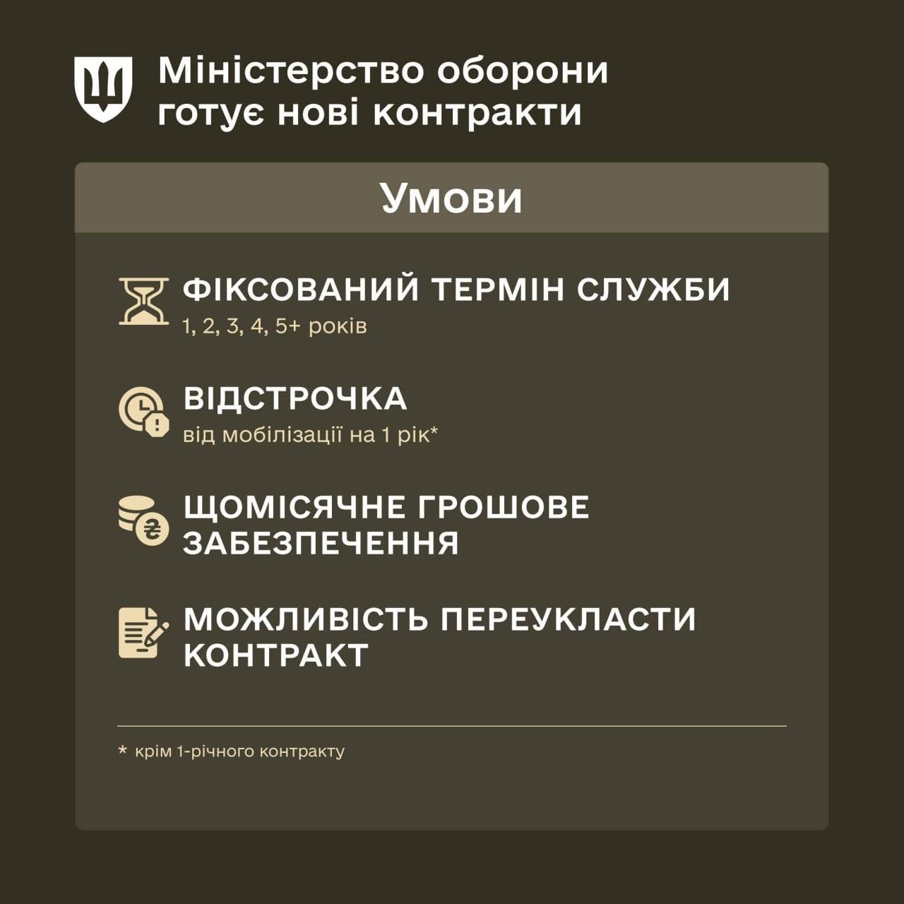 Передбачено, що ті, хто укладе контракт на 2–5 років, отримають право на річну відстрочку від мобілізації після його завершення. Укласти такі контракти зможуть резервісти, військові в запасі та мобілізовані бійці. Чинні контрактники зможуть перейти на оновлені умови.