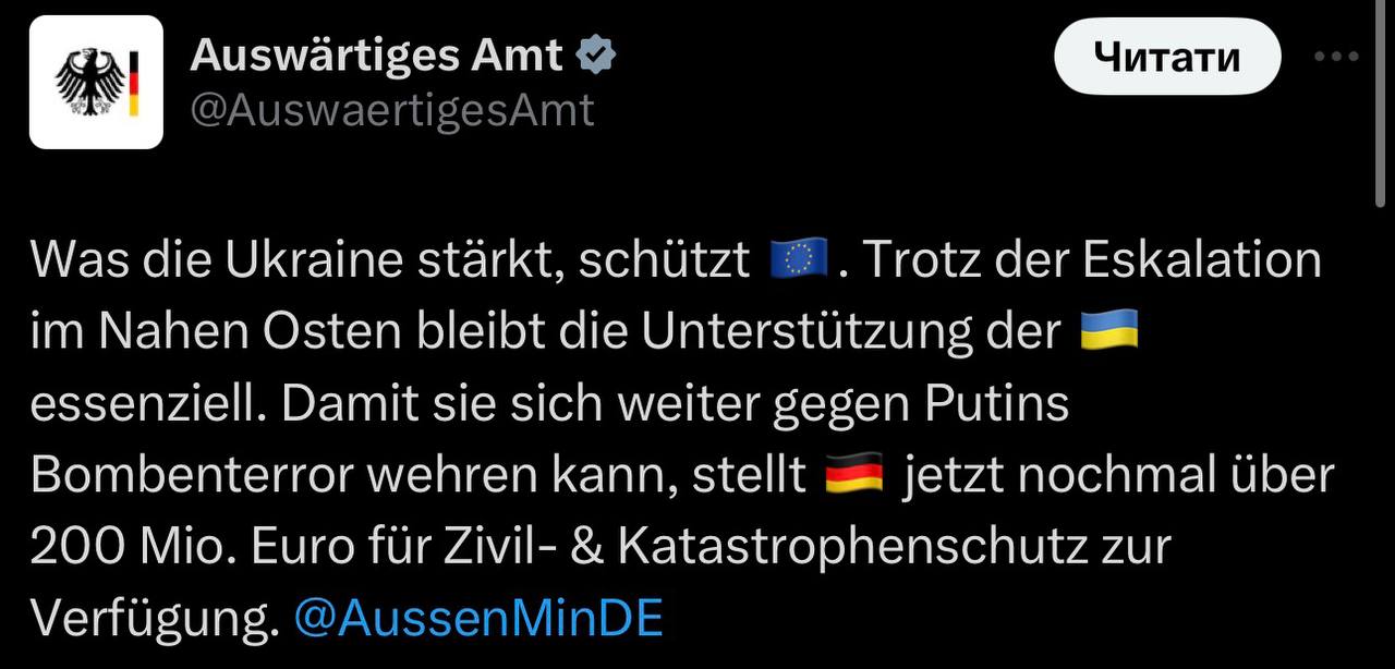 Те, що зміцнює Україну, захищає Європу. Попри ескалацію конфлікту на Близькому Сході, підтримка України залишається надзвичайно важливою. Щоб Україна могла й надалі протистояти бомбардуванням Путіна, Німеччина виділяє ще понад €200 млн на цивільний захист та захист від надзвичайних ситуацій.