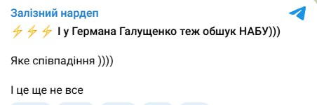 ️️Не тільки у Міндіча: НАБУ проводить обшук у Галущенка та в “Енергоатомі” — Железняк Народний депутат Ярослав Железняк повідомив у своєму Telegram-каналі про нові слідчі дії антикорупційних органів. “І у Германа Галущенка теж обшук НАБУ. Яке співпадіння. І це ще не все”, — написав він. Пізніше парламентар додав: “І в Енергоатомі говорять теж. Прям не день, а свято”.