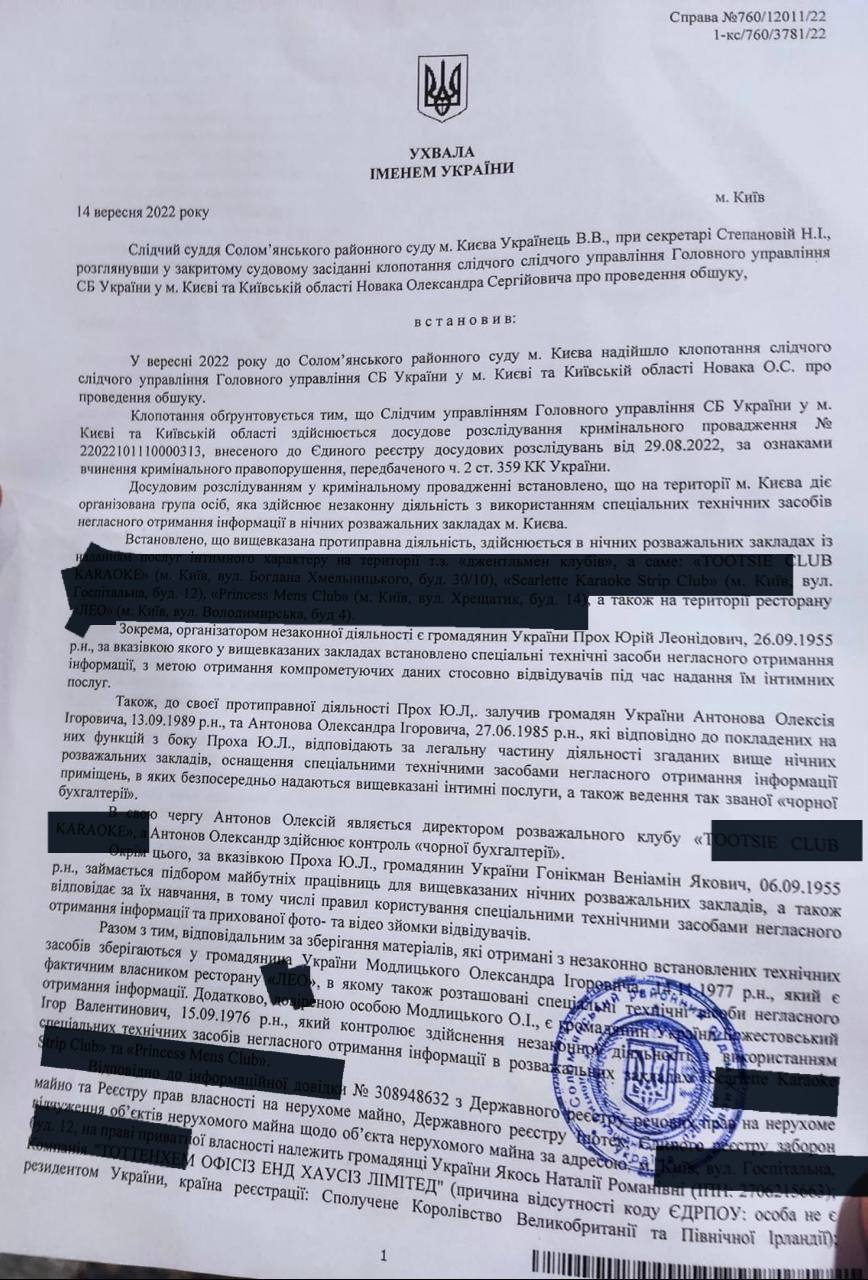 Фігуранти: Прох Юрій Леонідович, Антонов Олексій Ігорович, Гонікман Веніамин Якович – це довірені особи Артура Палатного, які управляли стріп-клубами: