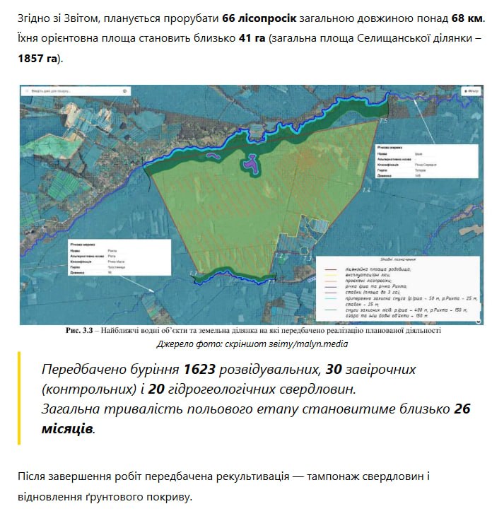 Згідно зі звітом, планується пробурити 1623 розвідувальні, 30 контрольних і 20 гідрогеологічних свердловин, а також прорубати 66 лісопросік загальною довжиною понад 68 км і площею близько 41 га.