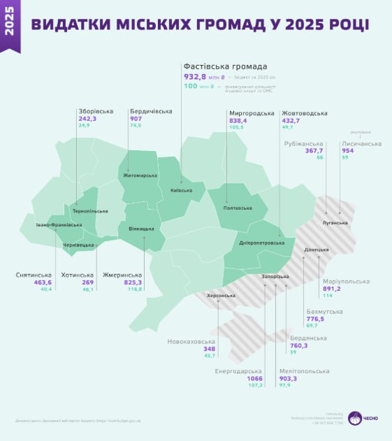 ЧЕСНО порівнює ці показники з бюджетами неокупованих громад: Фастівська — 932,8 млн грн, Бердичівська — 907 млн грн, Миргородська — 838,4 млн грн.