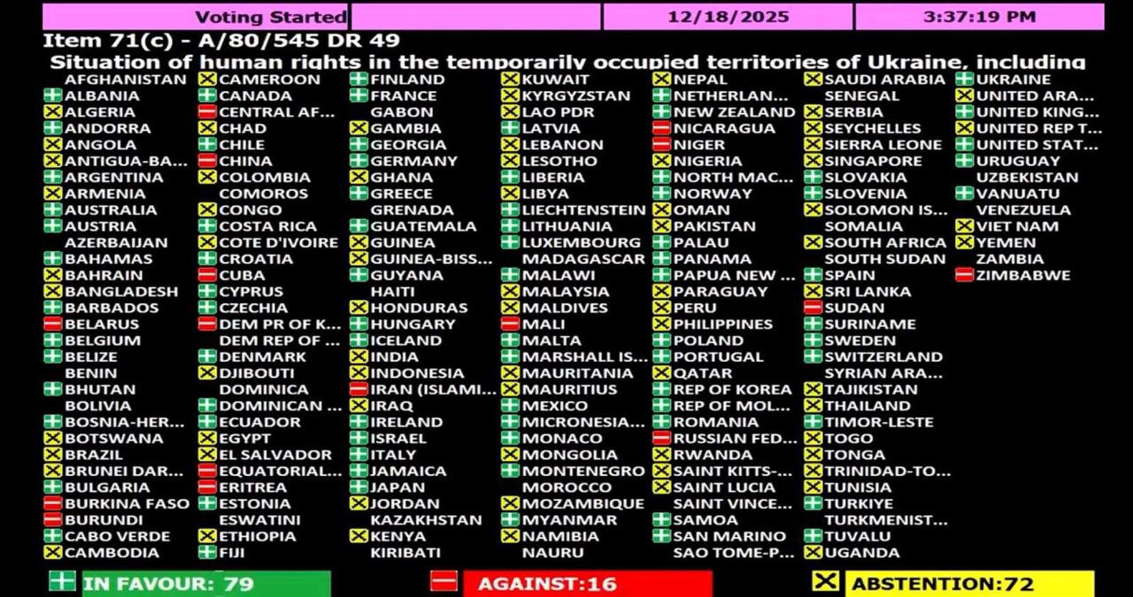 ️Генеральна Асамблея ООН щойно ухвалила вирішальну резолюцію щодо кричущих порушень прав людини на тимчасово окупованих Росією територіях України – постійний представник України при ООН Андрій Мельник.