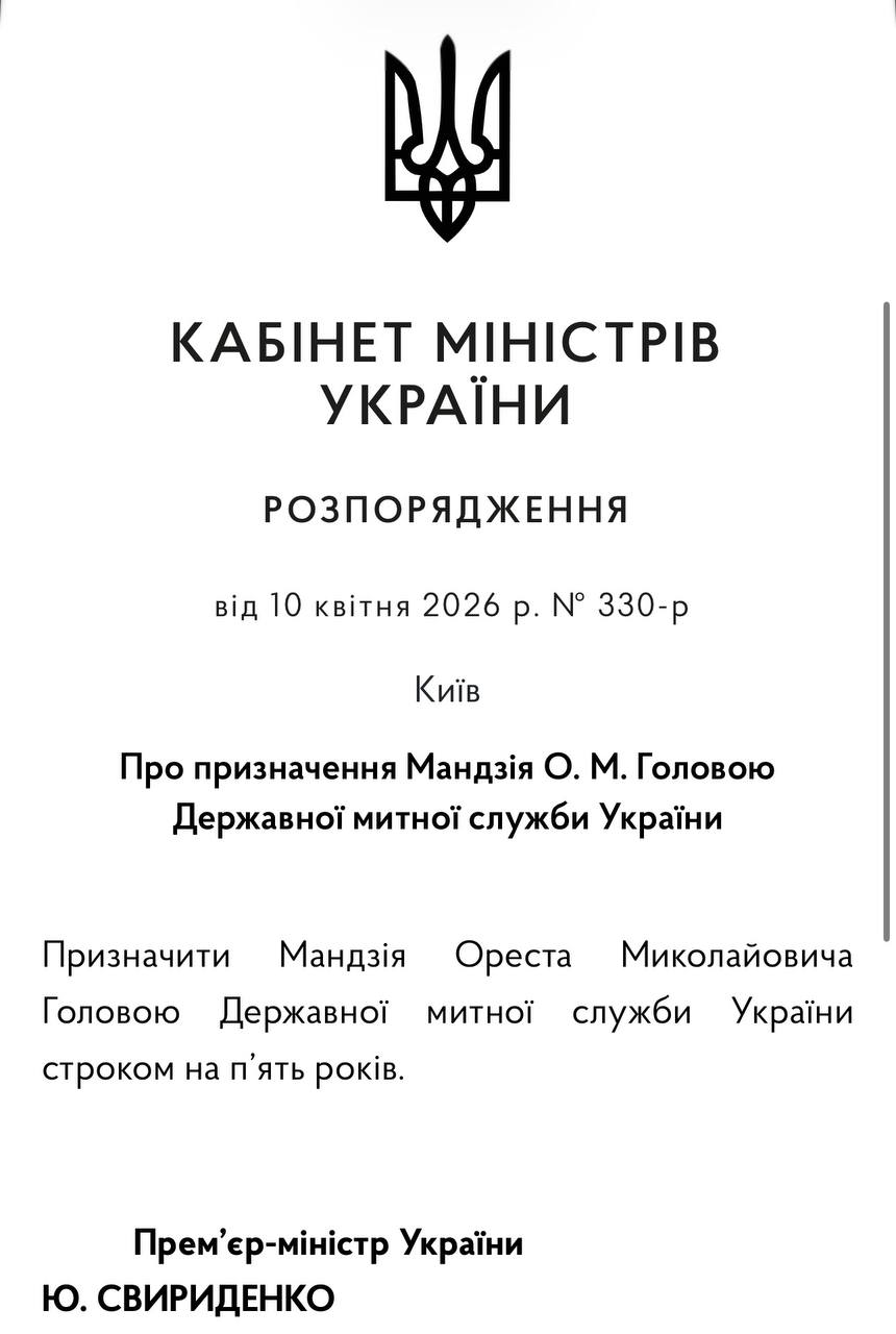 ️Тепер офіційно: розпорядження про призначення Ореста Мандзія Головою Державної митної служби зʼявилось на сайті Уряду